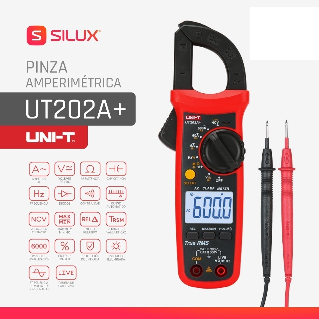 UT202A + 600V AC DC medición de voltaje, 600A AC medida de corriente, MAX/MIN/función de valores eficaces verdaderos: voltaje AC/DC, medida de corriente AC, prueba de diodo, resistencia, zumbador de continuidad, AC Frecuencia de retroiluminación. ESPECIFICACIONES: • Modelo: UT202A+. • Corriente CA (A): 600 A/± (2% + 10). • Frecuencia de corriente CA (Hz): 50 Hz ~ 100 Hz/± (1% + 5). • Voltaje de CA (V): 600 V/±(0,8%+5). • Frecuencia de voltaje CA (Hz): 10 Hz ~ 10 kHz/± (1%+5). • Voltaje CC (A): 600 V/± (0,5% + 2). • Resistencia (Ω): 60 MΩ/±(0,8%+2). • Capacitancia (F): 60 mF/±(4%+5). • Frecuencia (Hz): 10 Hz-10 MHz/± (0,1 %+4). CARACTERÍSTICAS: • Número de pantallas: 6000 • Alcance automático: sí. • Apertura de la mandíbula: 1.102 in. • True RMS: sí. • NCV: sí. • Prueba de cable en directo: sí. • Prueba de continuidad: sí. • Diodo: √ • Máx./min: sí. • Modo relativo: sí. • Almacenamiento de datos: sí. • Indicación de batería baja: sí. • Apagado automático: sí.