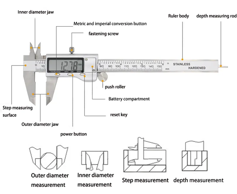 El calibrador digital pie de rey cuenta con una pantalla LCD grande y fácil de leer, que permite visualizar medidas en unidades métricas e inglesas. Su cuerpo está fabricado en acero inoxidable, con una cubierta de plástico ABS, garantizando durabilidad y resistencia. Las características incluyen: – Métodos de medición métrico e inglés, con conversión automática de longitud. – Medición de encendido automático y apagado inteligente para ahorrar energía. – Capacidad para medir diámetros externos e internos, pasos, alturas y profundidades. – Diseño de rueda auxiliar de metal cerrado, que mejora la precisión de las mediciones. Con un rango de medición de 0 a 200 mm y una precisión de 0,004 mm, es una herramienta esencial para trabajos de precisión.